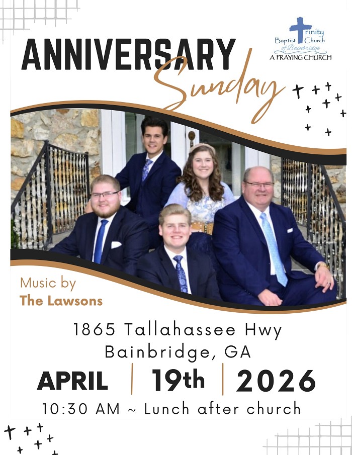 Welcome Trinity Baptist Church is an Independent Baptist Church located at 1865 Tallahassee Hwy in Bainbridge, Georgia. Our mission is to reach the lost and equip believers to apply God's Word to their lives. If you are looking for a church home or if you are visiting the Bainbridge area, we would love to have you visit us at Trinity Baptist Church. You will feel right at home in the warm, friendly atmosphere our church provides. We welcome you to come see for yourself. For contact information and driving directions, please click on Contact Us. If you would like more information about our church, feel free to contact our office by phone at 229.243.8870 or email us at tbcbainbridge@att.net.