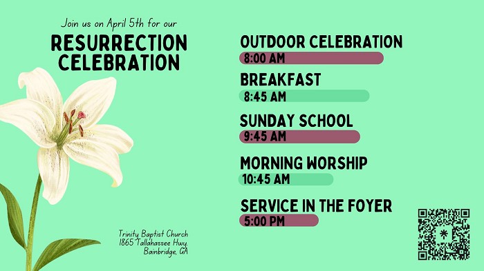 Welcome Trinity Baptist Church is an Independent Baptist Church located at 1865 Tallahassee Hwy in Bainbridge, Georgia. Our mission is to reach the lost and equip believers to apply God's Word to their lives. If you are looking for a church home or if you are visiting the Bainbridge area, we would love to have you visit us at Trinity Baptist Church. You will feel right at home in the warm, friendly atmosphere our church provides. We welcome you to come see for yourself. For contact information and driving directions, please click on Contact Us. If you would like more information about our church, feel free to contact our office by phone at 229.243.8870 or email us at tbcbainbridge@att.net.